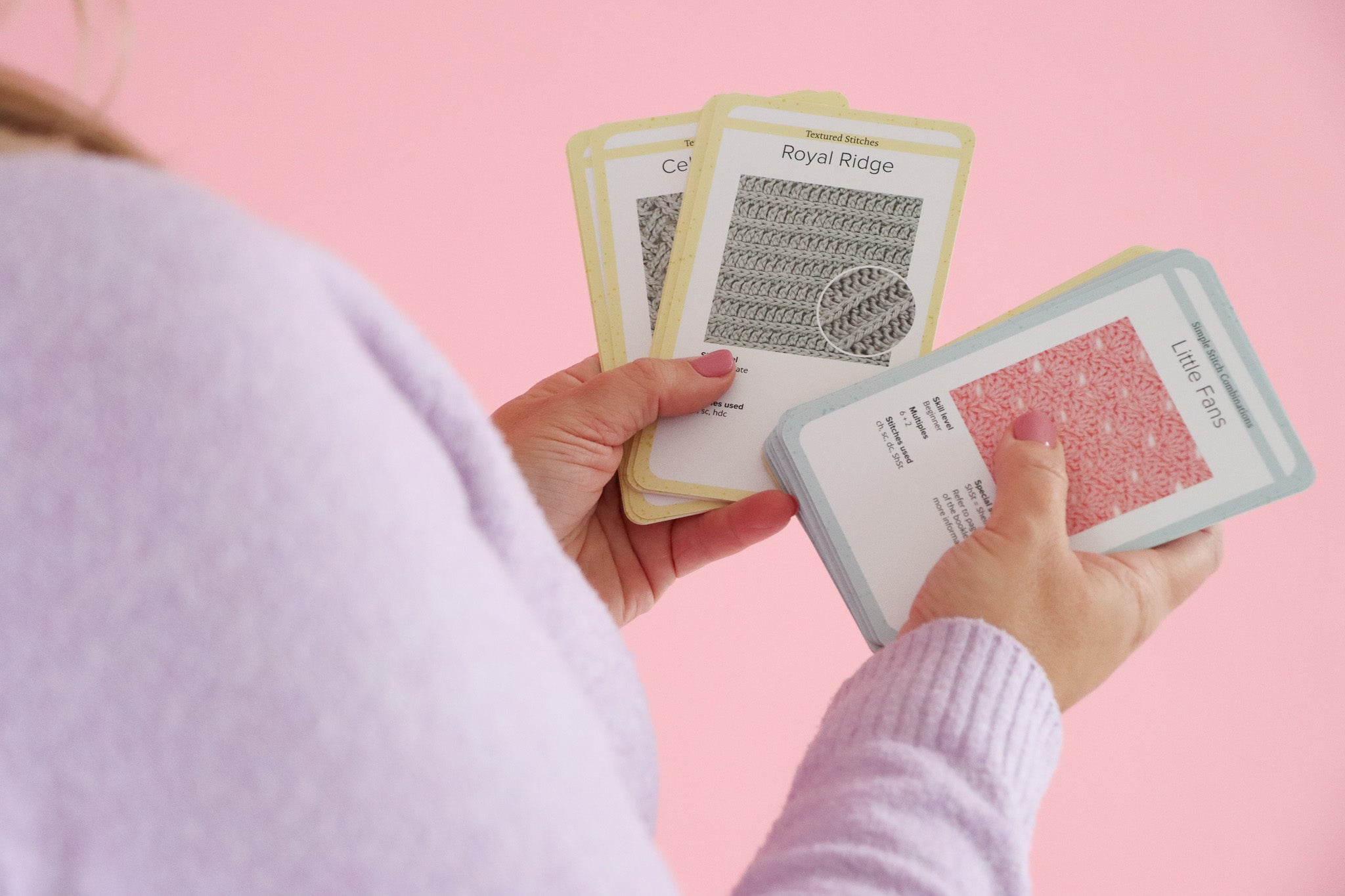 The cards use US crochet terms, with a UK conversion chart given. They are organised into two different categories – ‘simple stitch combos’ and ‘textured stitches’. On each card you’ll find: